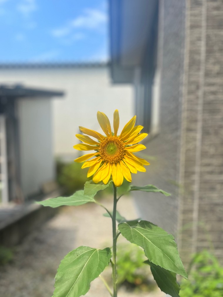 茎のしっかりとした、黄色く輝くひまわりが一輪、